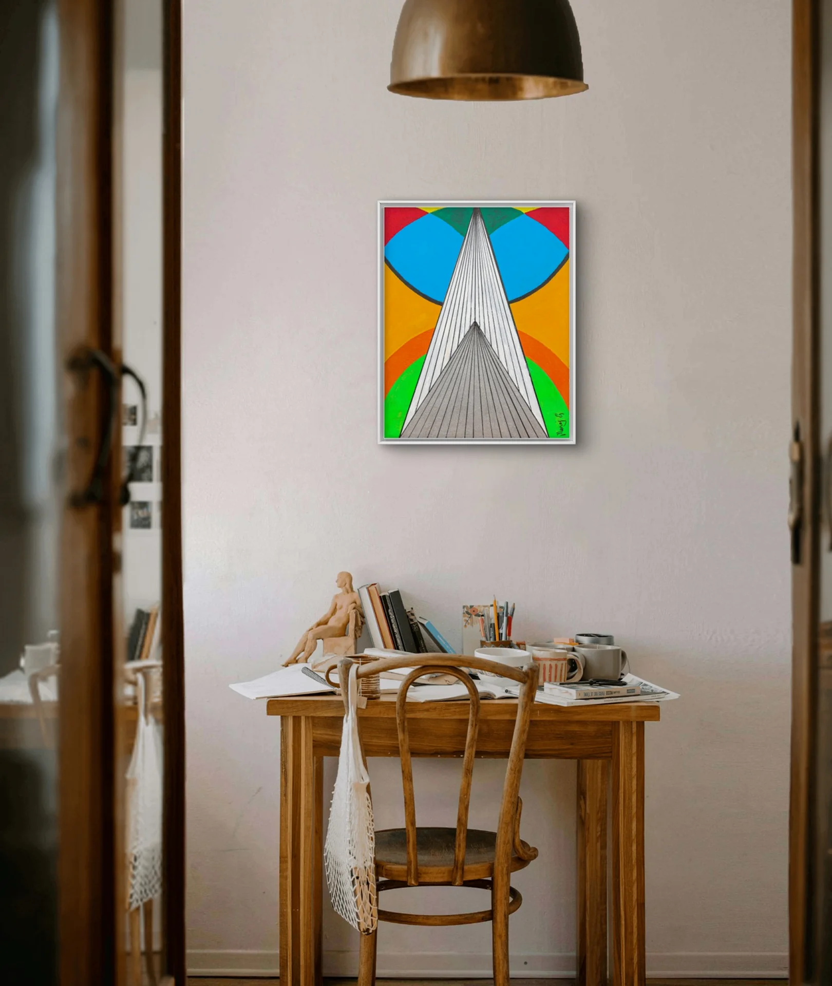In the garden of abstraction, geometry blooms like celestial flora. Curves and triangles are seen as elemental symbols that transcend culture and time. They express ideas of harmony, balance, and infinity. Triangles stand like proud mountain peaks, sharp and resolute, their edges slicing through the veil of chaos to reveal hidden truths. Triangles pierce the canvas like arrows of energy, dynamic and directional, invoking upward movement and achievement. The repetition of shapes becomes a mantra, a visual depiction of unity and multiplicity. This piece is great for a modern home.