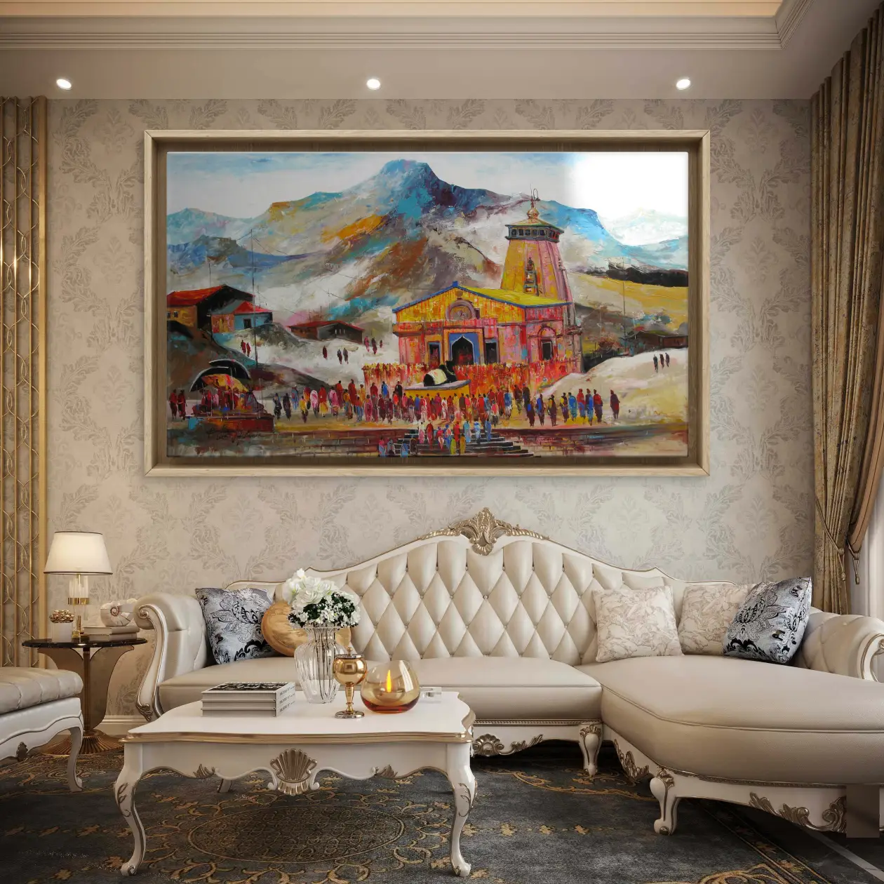 This impressive work by a renowned artist displays the legendary Kedarnath monument that withstood flash floods and the test of time. Offering spiritual sanctuary , the doorway beckons while the Himalayan mountains loom afar.